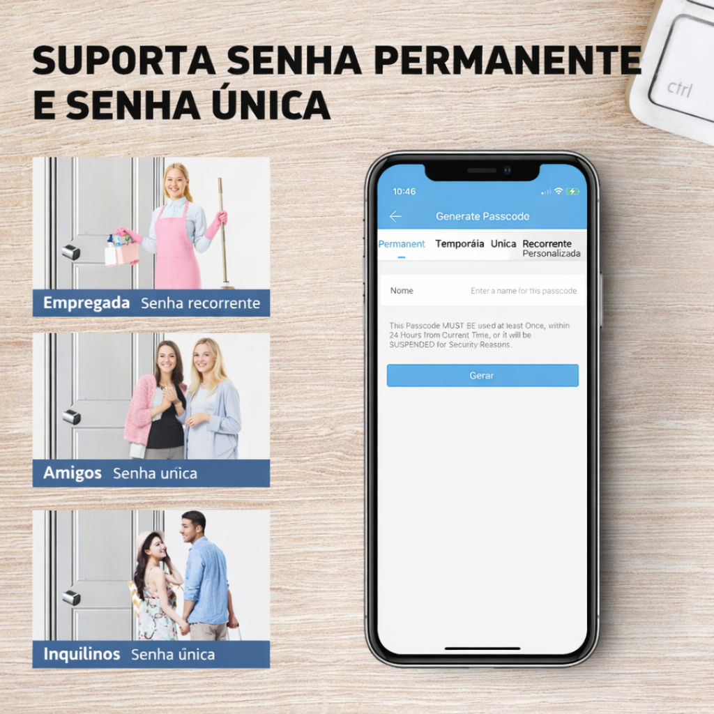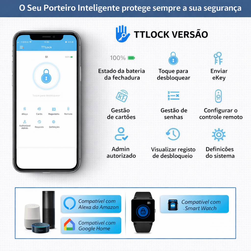 Através de App (TTLock), código, cartão ou chave tradicional -