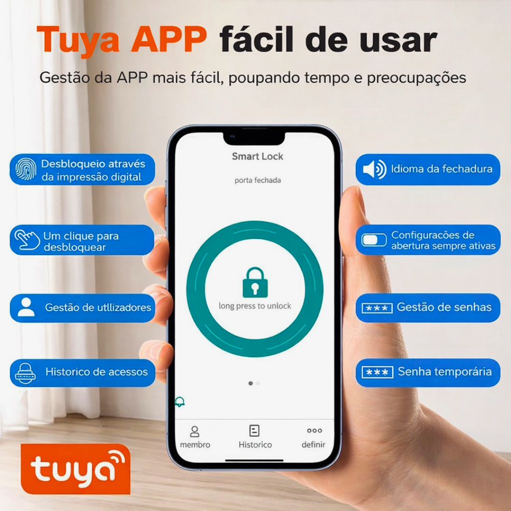 Abra a sua porta com o telemóvel, impressão digital ou código sem chaves, sem complicações.